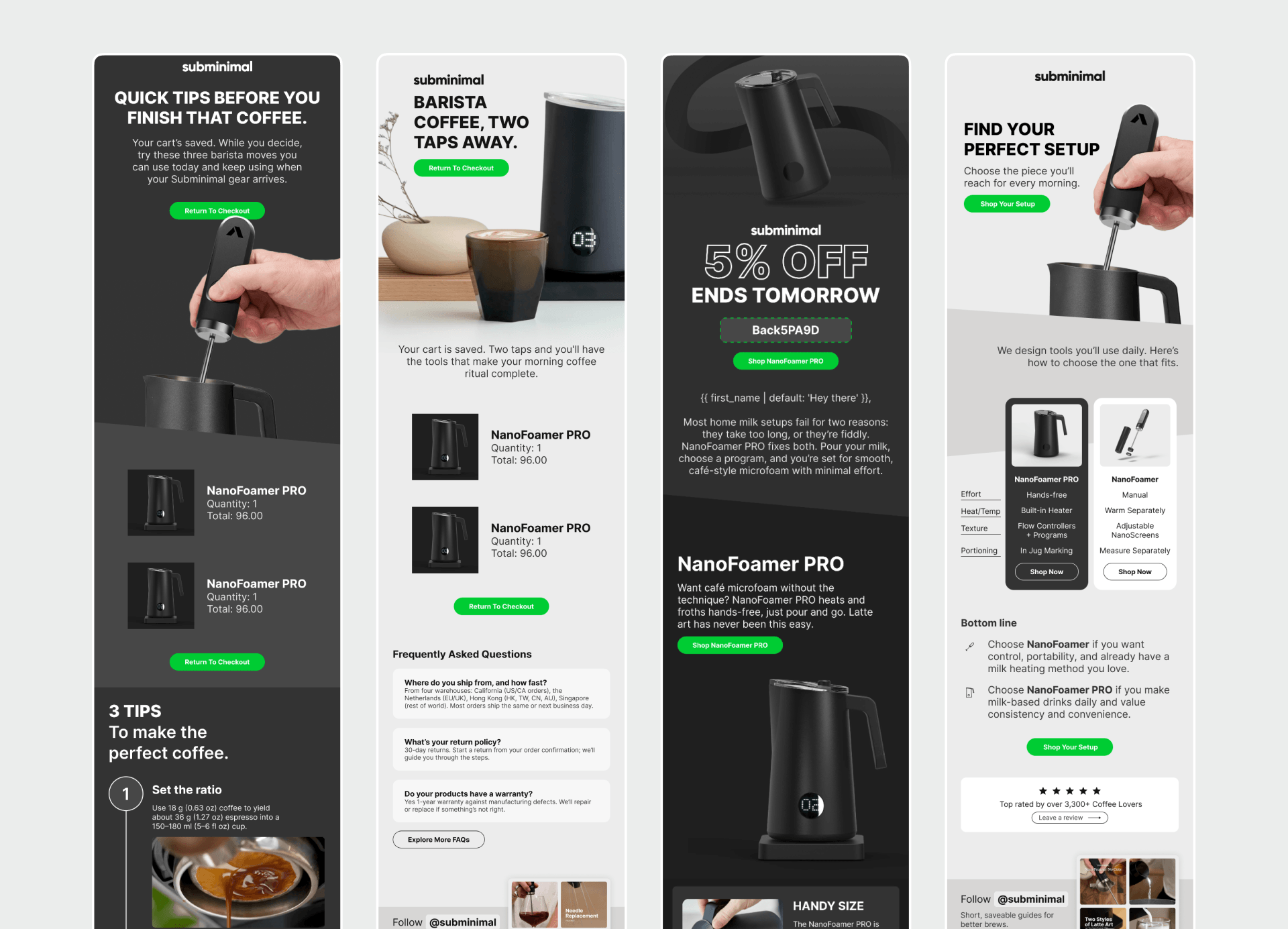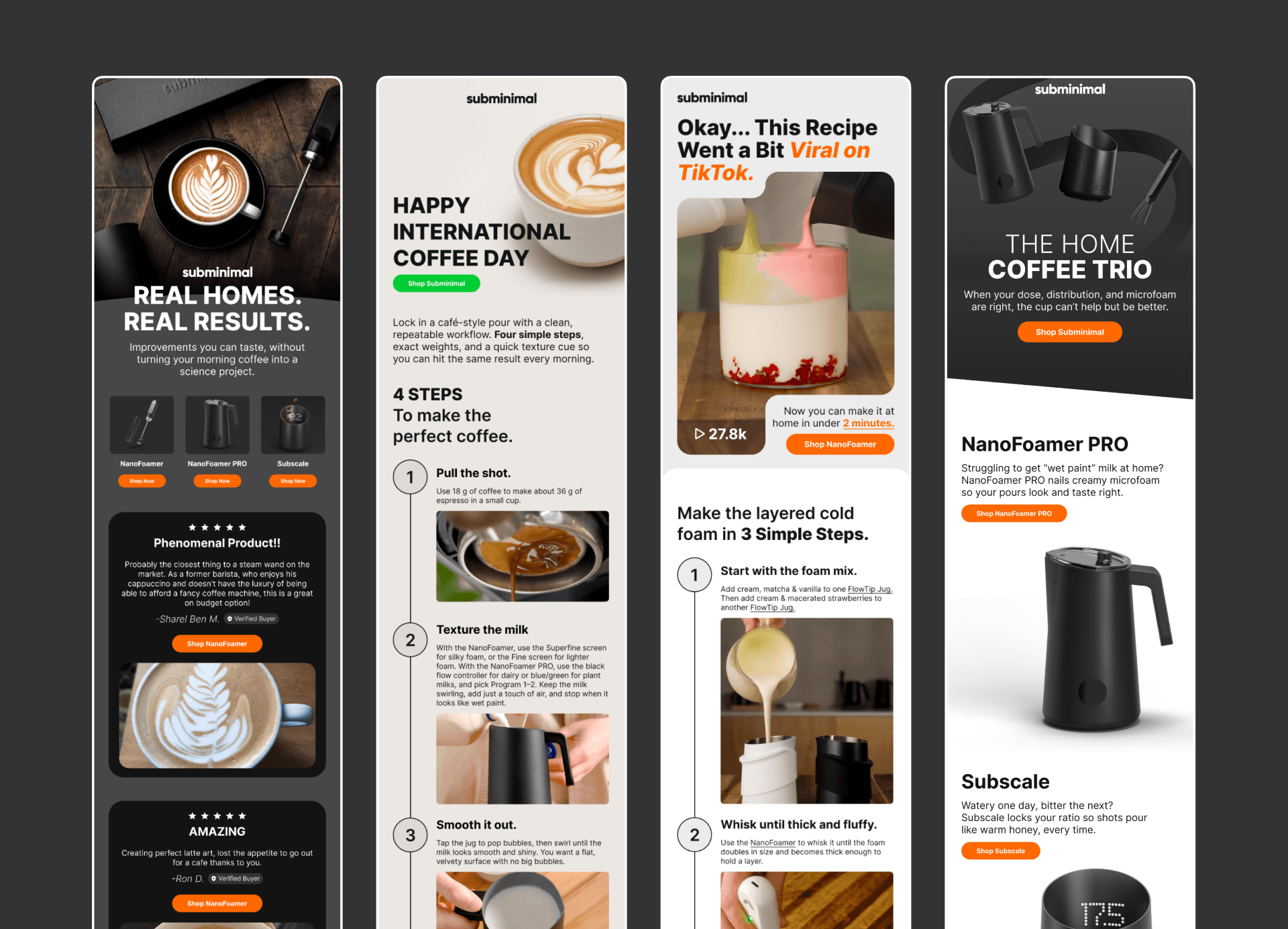 Picos rebuilt Subminimal's flow ecosystem from the ground up, introducing a full suite of unique automation sequences with a cohesive design language that matched the brand's clean, minimal aesthetic. A structured campaign calendar was implemented alongside pop-up optimisation to strengthen list capture and improve entry-point performance. Deliverability was treated as a priority from the outset - with segmentation and engagement-based targeting used to clean up list health and reduce spam rates, creating a stronger foundation for long-term performance.